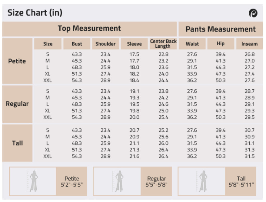 The size chart for these sets: